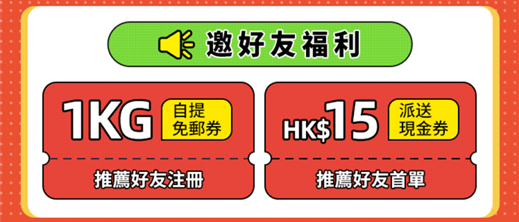 你推廣,我返利🎊推薦註冊,拎走1KG自提優惠券,💝推薦首單再得派送HK$15現金券💫,多邀多得,上不封頂~