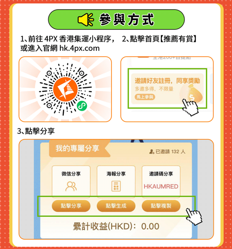 2.每邀請1位好友完成註冊,您將獲得1張自提1KG免郵券(到賬後有效期為30天,內地至香港清涼自提、集運自提、專綫自提適用);好友首單支付成功,您將再獲得1張HK$15派送現金券(到賬後有效期為30天,内地至香港特惠專線、專綫派送、傢俱家電專線、重貨專綫適用)。